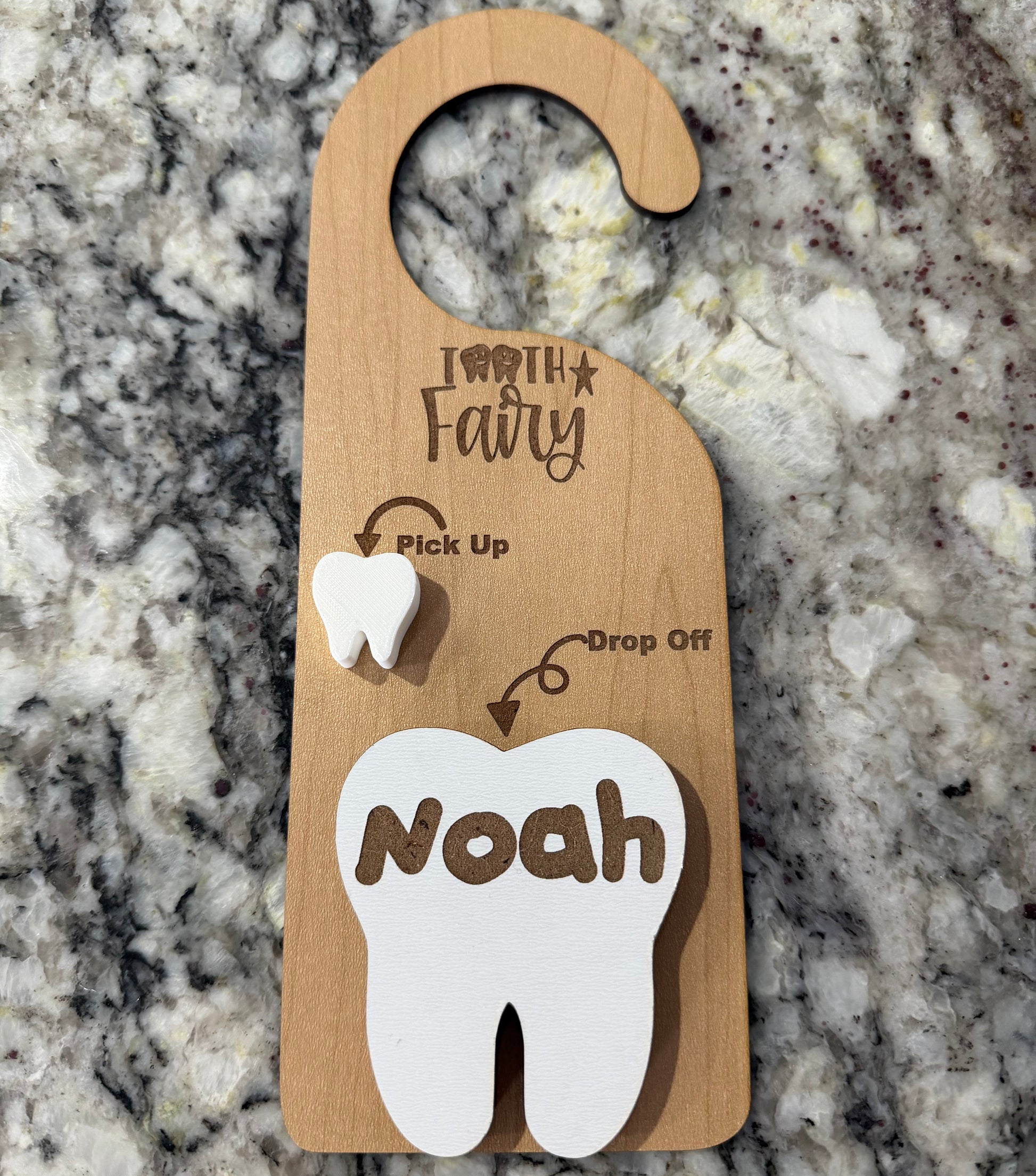 Make tooth nights easier. Hang this Tooth Fairy door hanger on your child’s doorknob, tuck the tooth into the pocket, and the Tooth Fairy can swap it for a surprise without hunting under a pillow. A fun keepsake for every lost tooth. Made from TruFlat wood and a small 3D printed tooth holder. Approximately 3.5" x 10".
